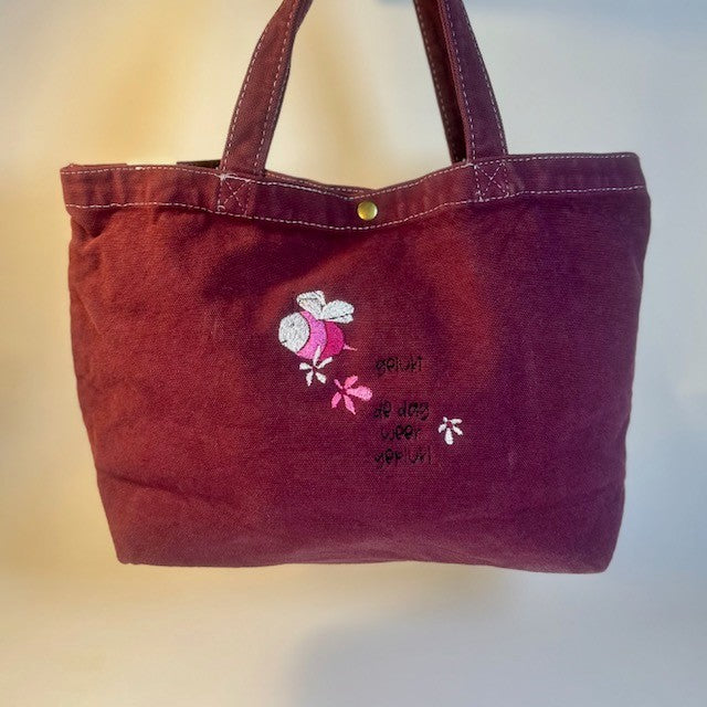 een donkerrood tasje van stevig canvas met een lieve hommel