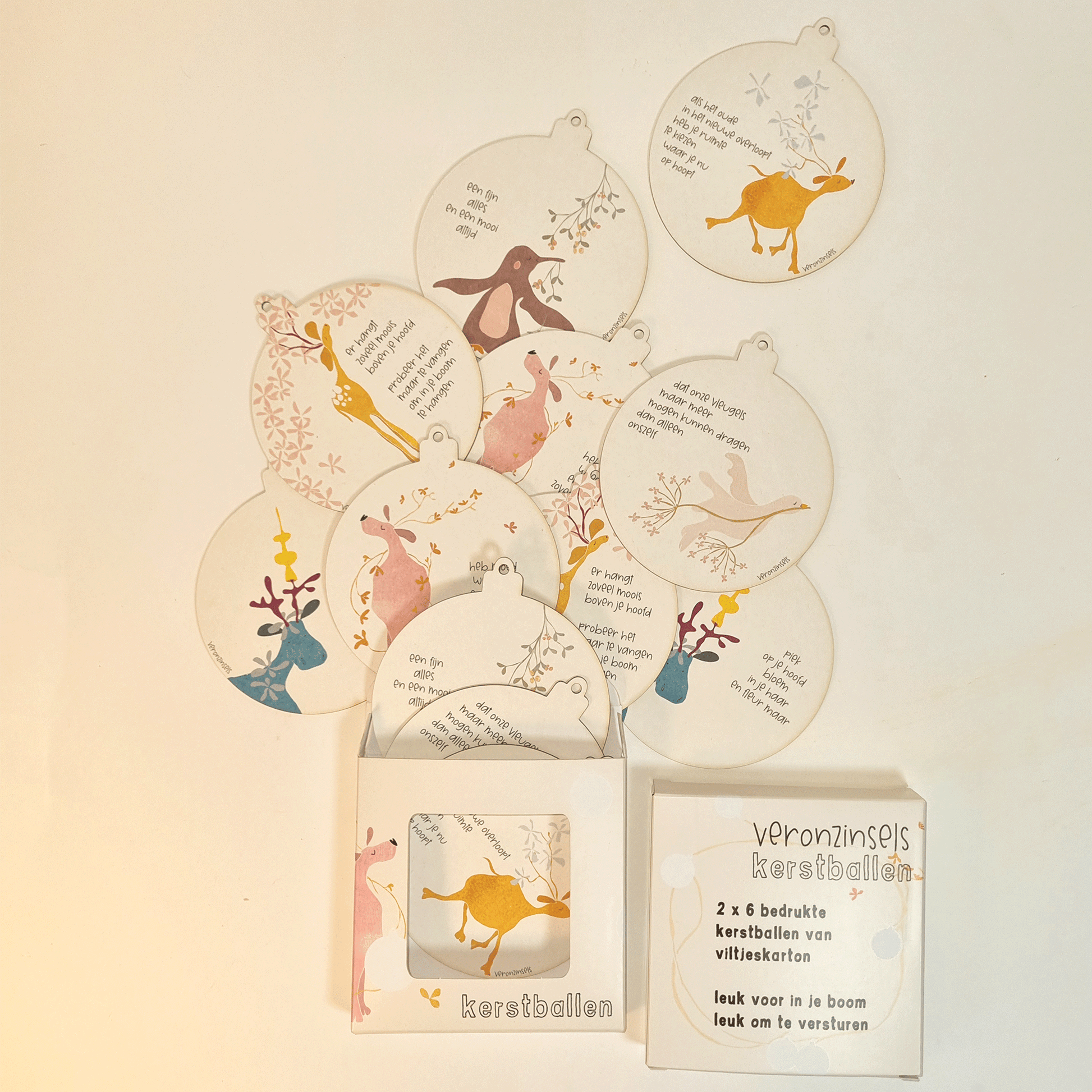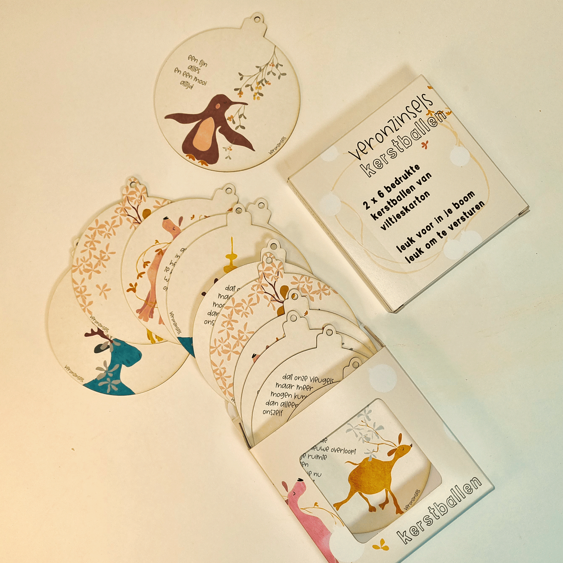 een doosje met 2 x 6 verschillende kerstbalkaartjes van stevig viltjeskarton
