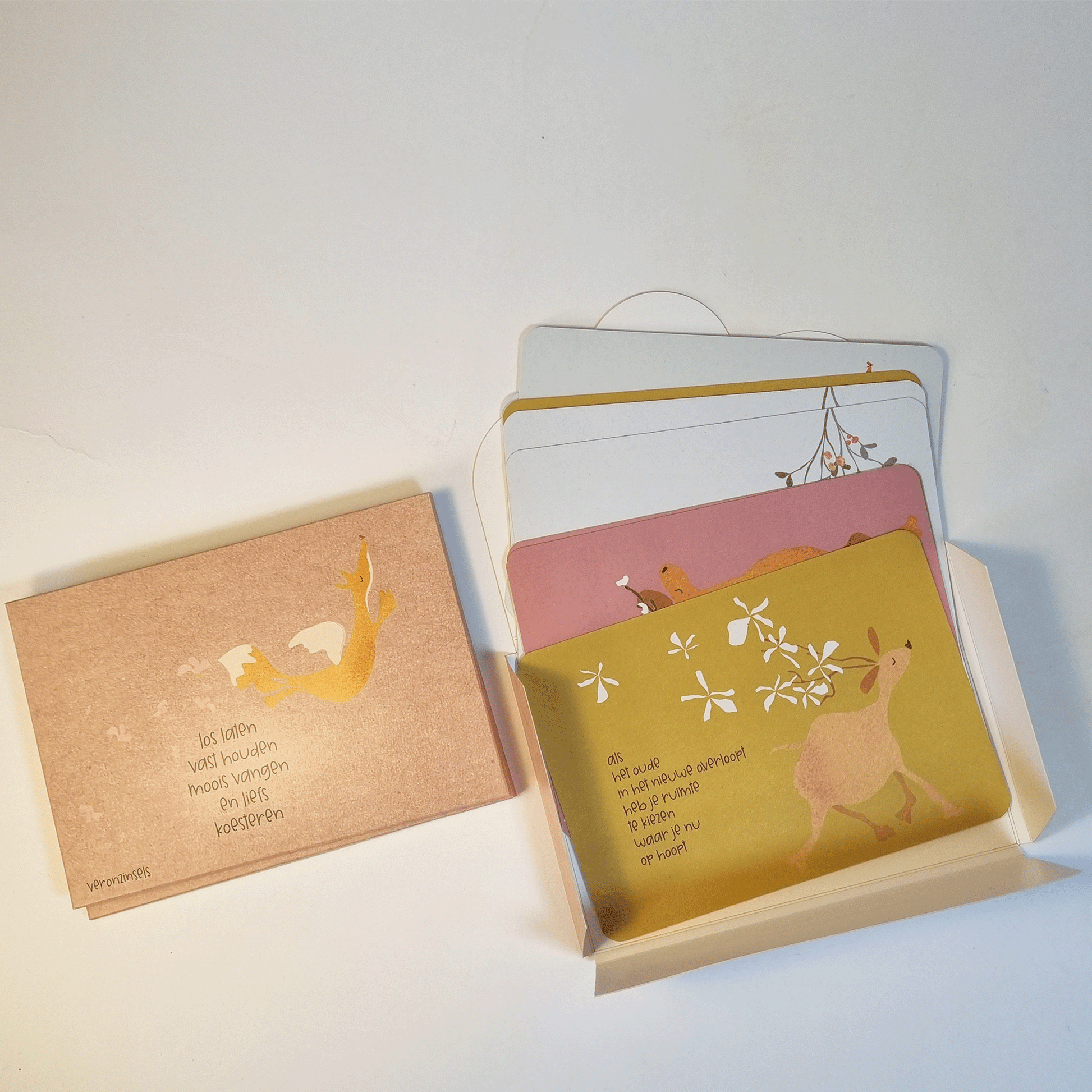 de kaarten zijn gedrukt op 100% gerecycled 300 grs karton, en hebben afgeronde hoeken