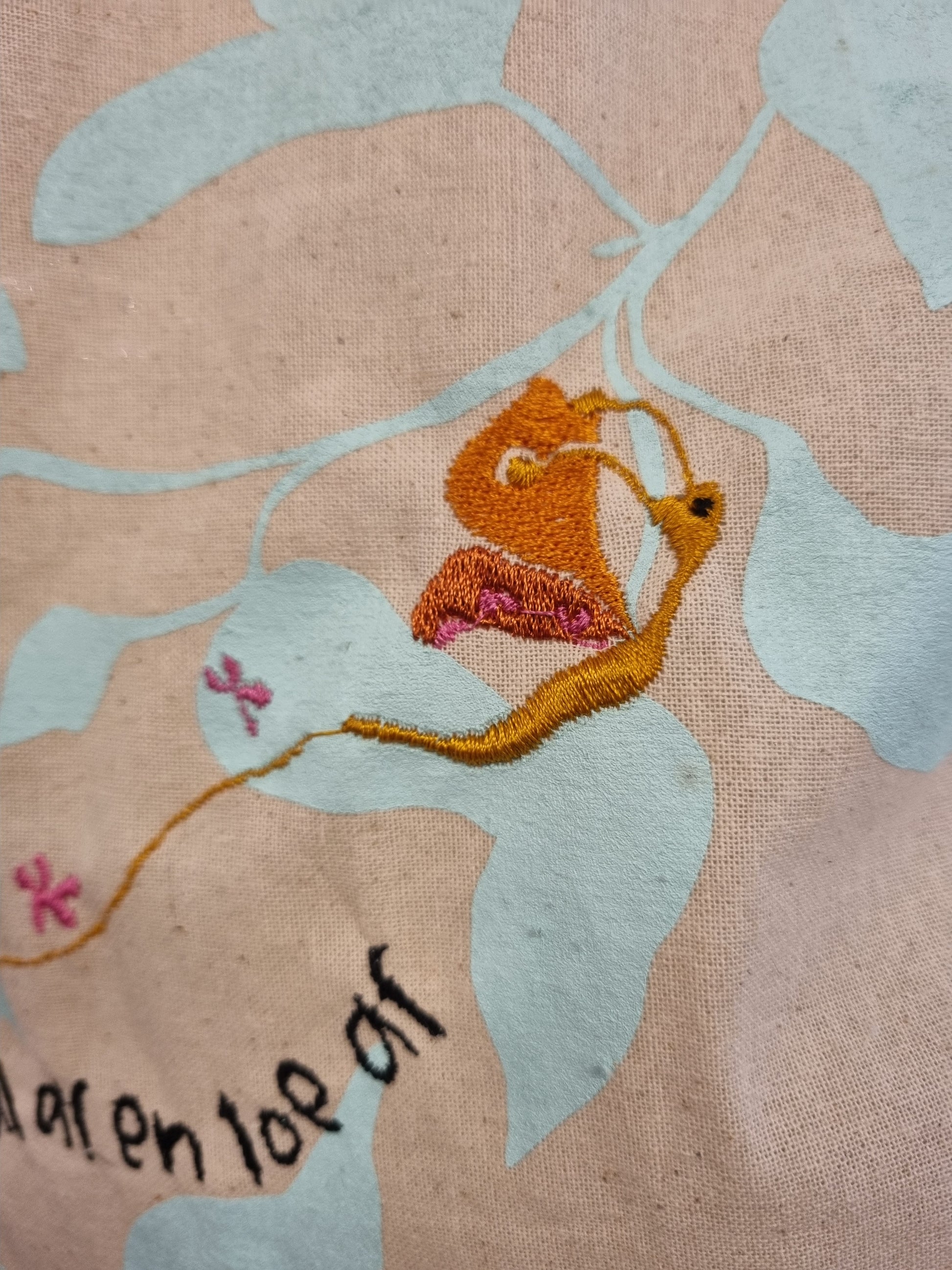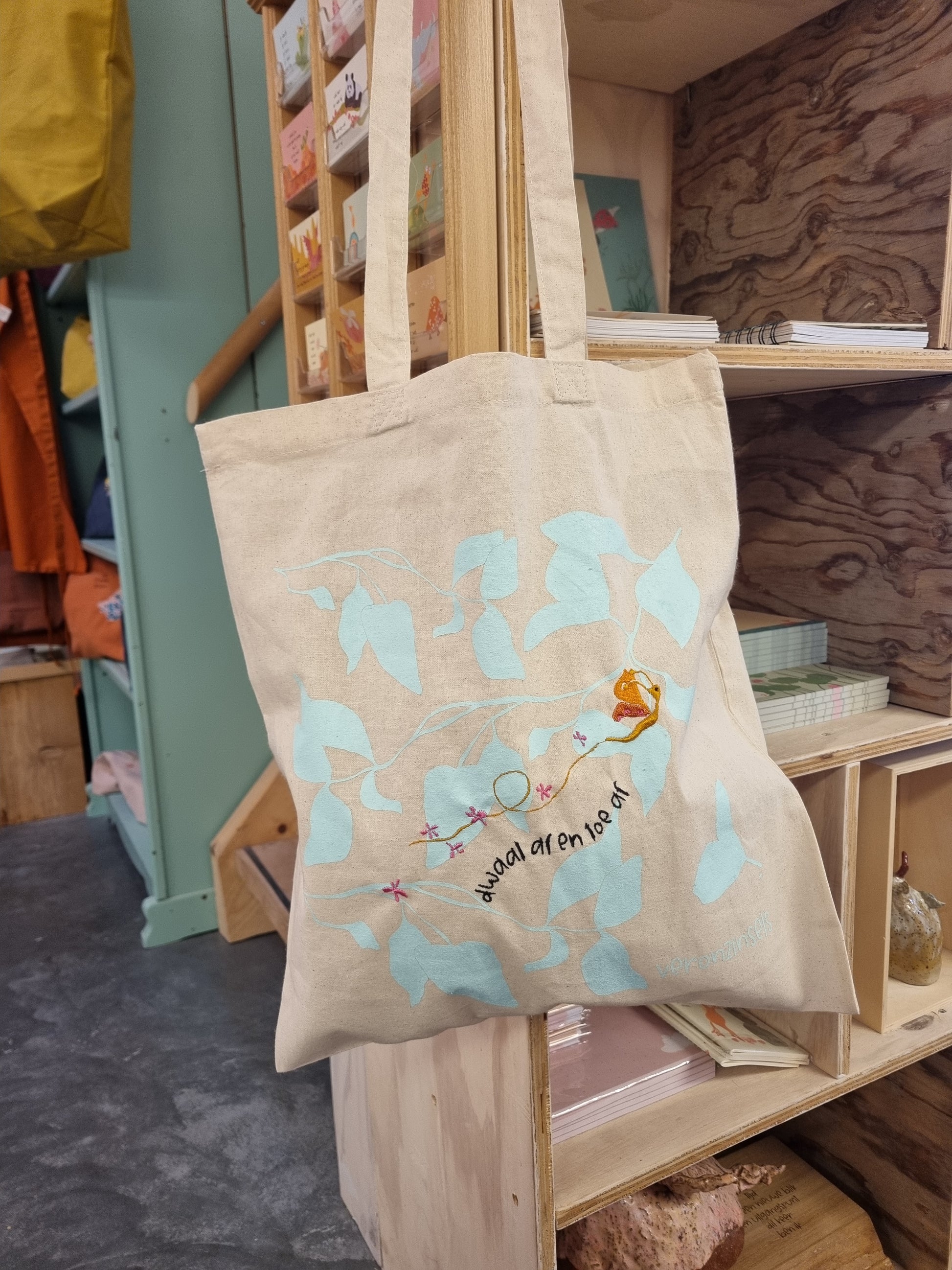 we hebben het tasje laten bedrukken met een lichtturqoise bladmotief, en er daarna zelf overheen geborduurd