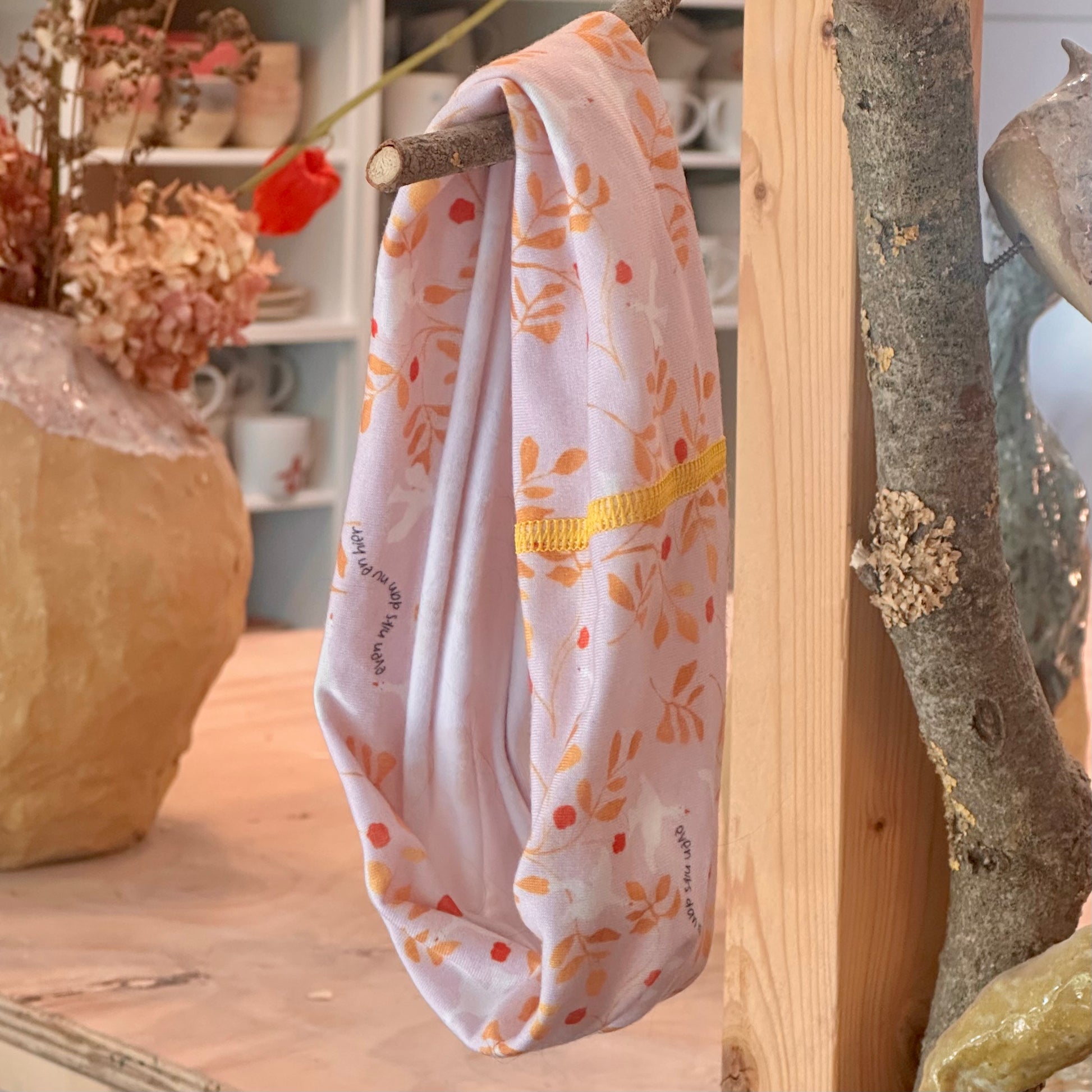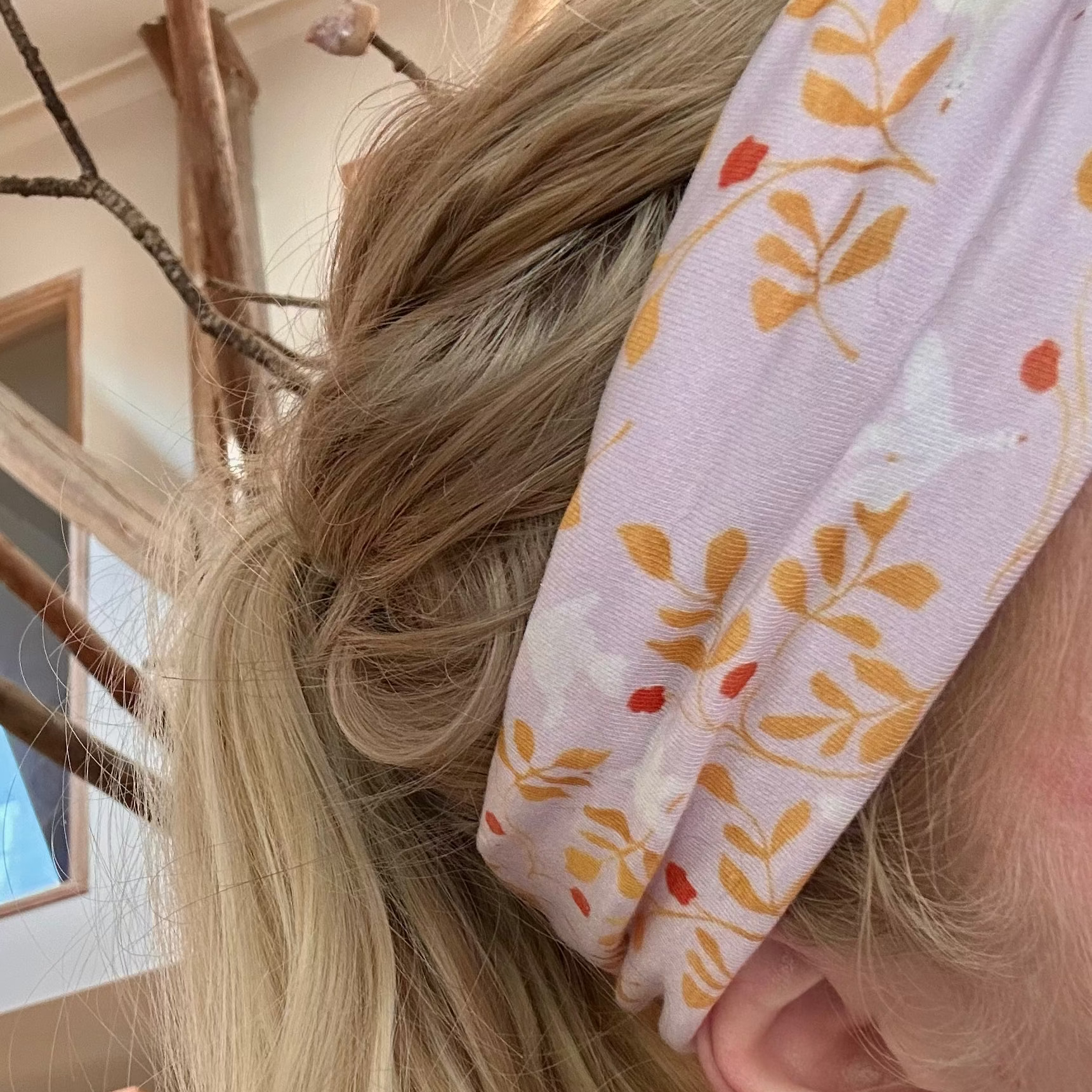 fijne haarband van zachtroze, zachte stof, bedrukt met gezellige vogeltjes, bloemen en de tekst 'even niks dan nu en hier'