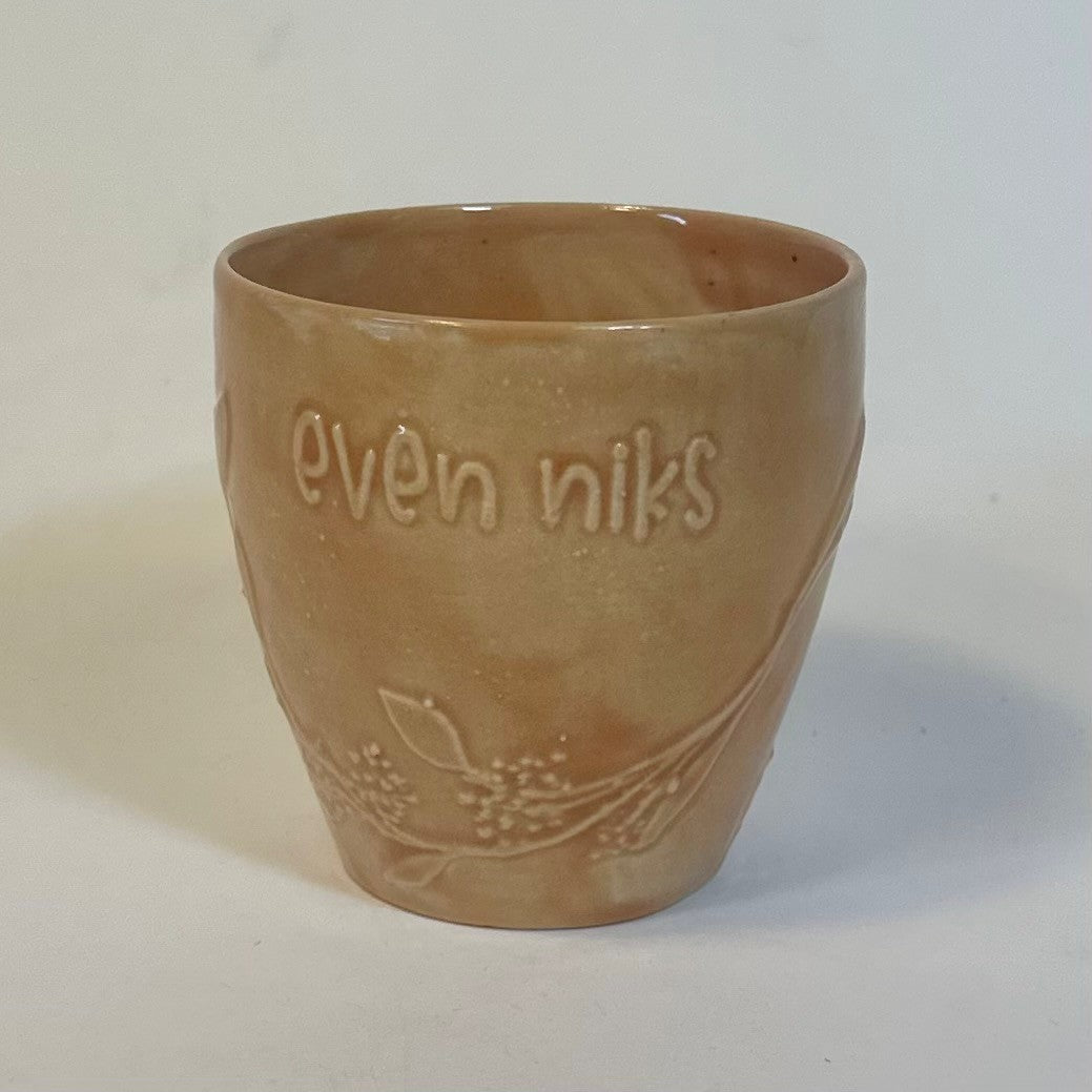 het zandbruinig gekleurde mokje heeft mooie opliggende takken, en is voorzien van het mooiewoord "even niks"