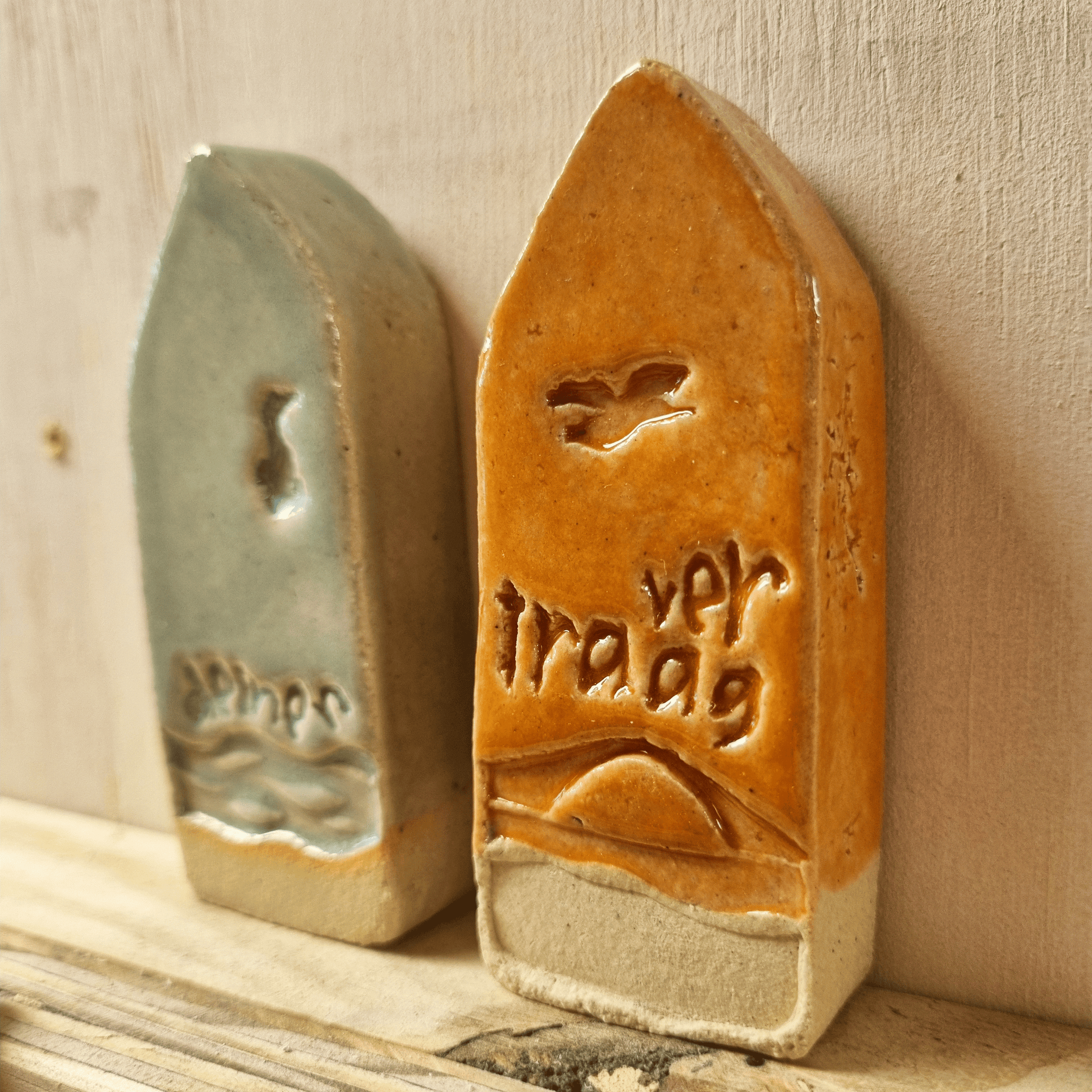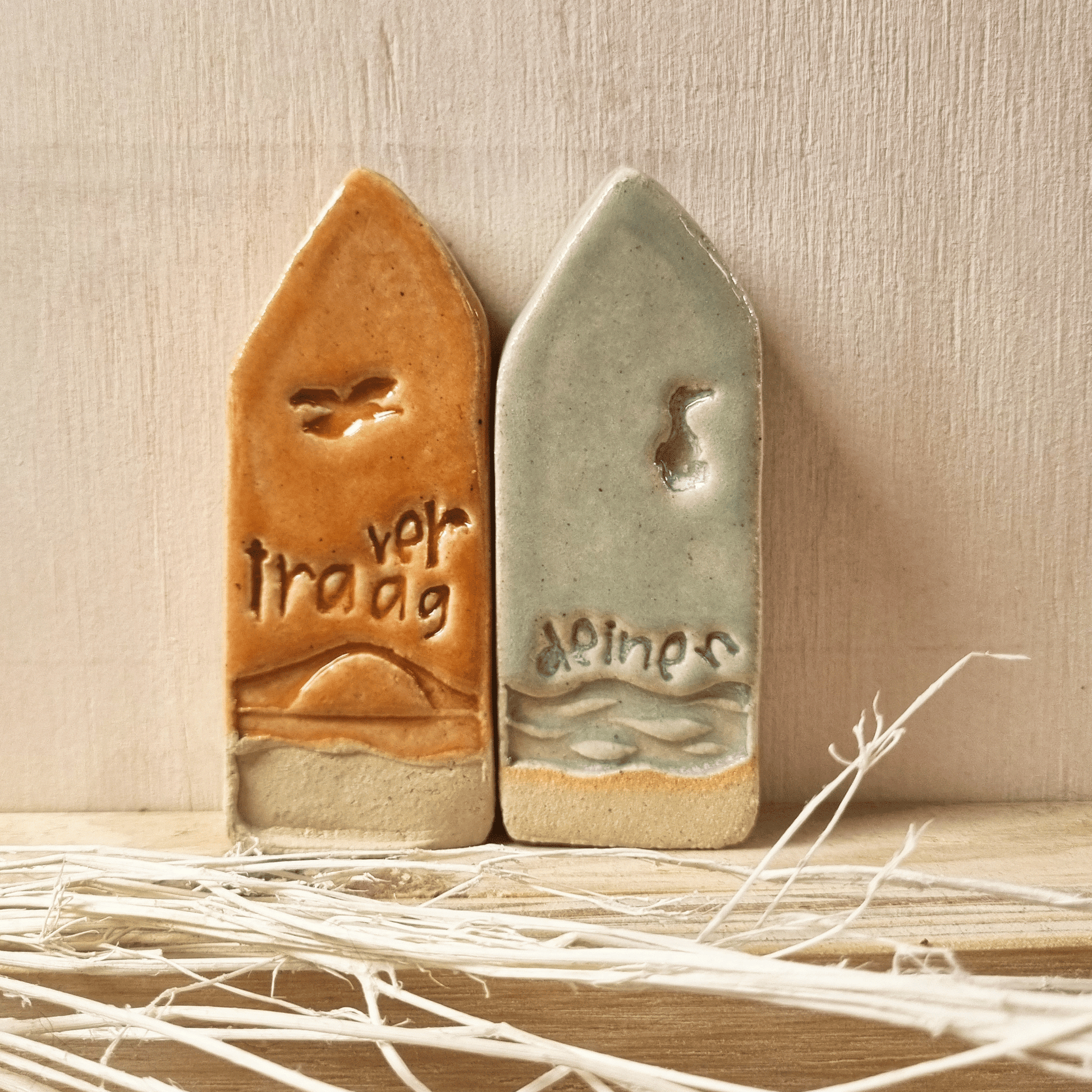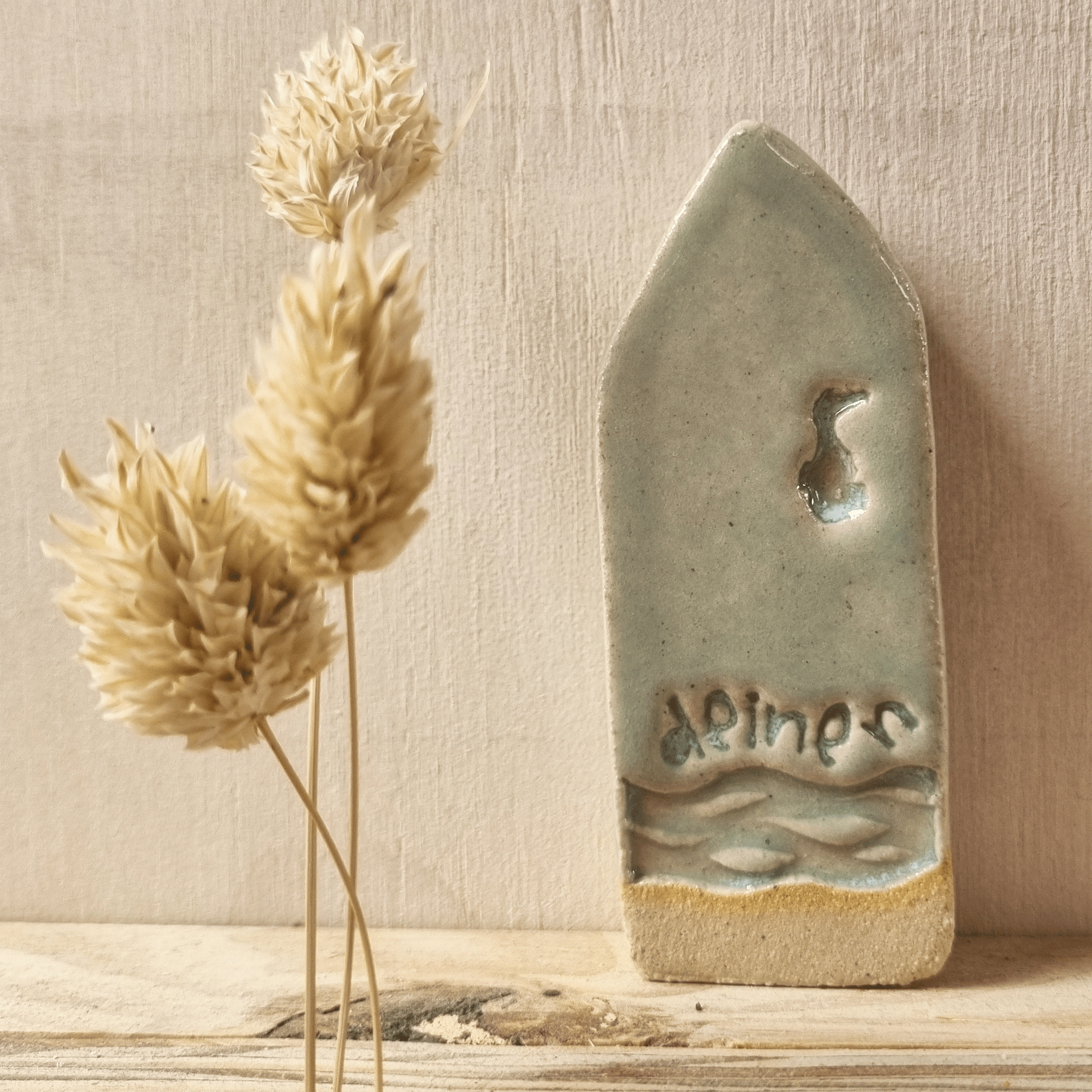 een zachtzeeblauwgroen strandhuisje van keramiek